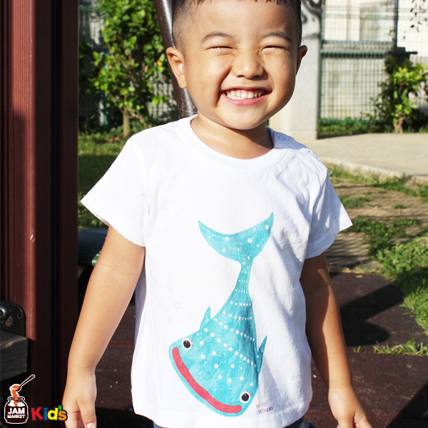 沖縄で活躍するアーティストSYOUTAとのコラボTシャツ。前面に大きなジンベエザメ。背面にはたくさんの海の生き物たちがいます。男の子ジンベエはジンベエザメのイラストを男の子っぽく。女の子ジンベエは頭にヒトデでリボンを付けてるようにしたデザインになっています。