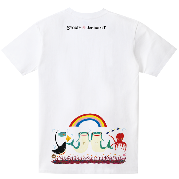 沖縄で活躍するアーティストSYOUTAとのコラボTシャツ。前面に大きなジンベエザメ。背面にはたくさんの海の生き物たちがいます。男の子ジンベエはジンベエザメのイラストを男の子っぽく。女の子ジンベエは頭にヒトデでリボンを付けてるようにしたデザインになっています。