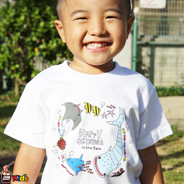 沖縄で活躍するアーティストSYOUTAとのコラボTシャツ。海の生き物をテーマでデザイン。ジンベエザメ、マンタ、マンボウといった魚達が優雅に泳いでいます。背面にはダイバーいます。