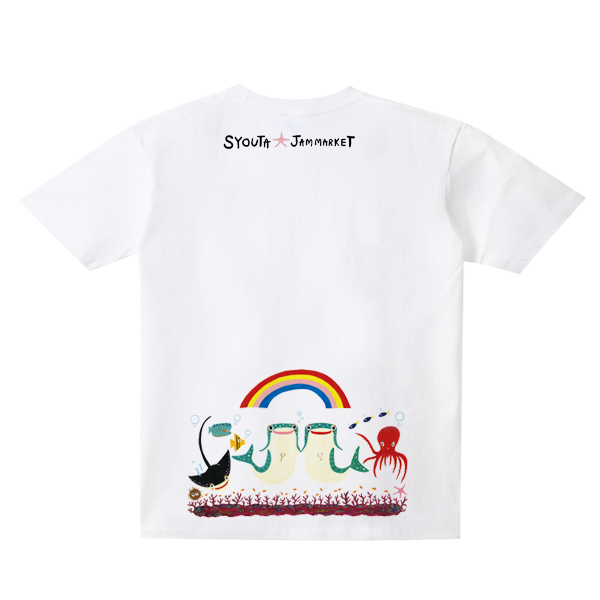 沖縄で活躍するアーティストSYOUTAとのコラボTシャツ。前面に大きなジンベエザメ。背面にはたくさんの海の生き物たちがいます。男の子ジンベエはジンベエザメのイラストを男の子っぽく。女の子ジンベエは頭にヒトデでリボンを付けてるようにしたデザインになっています。