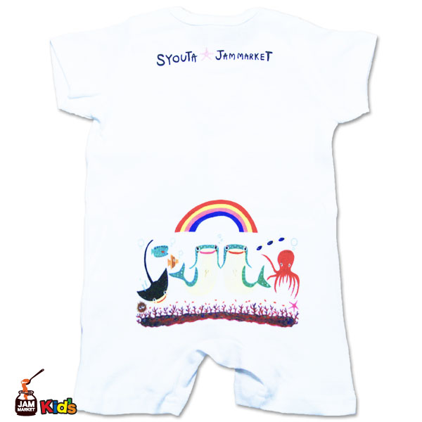 沖縄で活躍するアーティストSYOUTAとのコラボTシャツ。前面に大きなジンベエザメ。背面にはたくさんの海の生き物たちがいます。男の子ジンベエはジンベエザメのイラストを男の子っぽく。女の子ジンベエは頭にヒトデでリボンを付けてるようにしたデザインになっています。